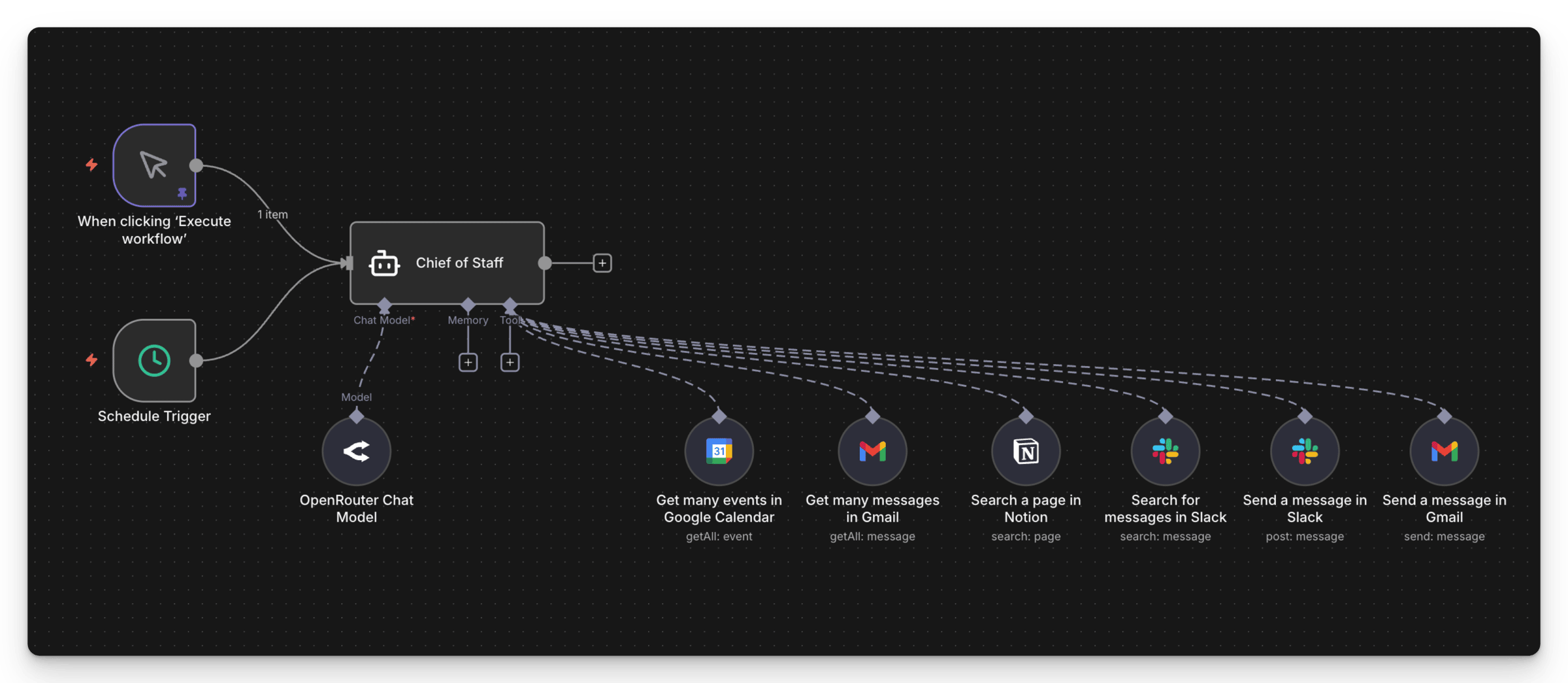 For example, my most-used agent is a 'chief of staff'. Nothing fancy. It reviews my day each morning and surfaces what matters from Calendar, Gmail Notion and Slack. It saves me 15 minutes of context-switching and triggers me with some actions to take.